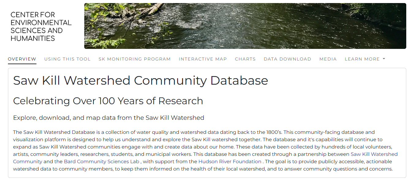 “The Saw Kill Watershed Database is a collection of water quality and watershed data dating back to the 1800’s. This community-facing database and visualization platform is designed to help us understand and explore the Saw Kill watershed together. The database and it’s capabilities will continue to expand as Saw Kill Watershed communities engage with and create data about our home. These data have been collected by hundreds of local volunteers, artists, community leaders, researchers, students, and municipal workers. This database has been created through a partnership between Saw Kill Watershed Community and the Bard Community Sciences Lab , with support from the Hudson River Foundation . The goal is to provide publicly accessible, actionable watershed data to community members, to keep them informed on the health of their local watershed, and to answer community questions and concerns.”